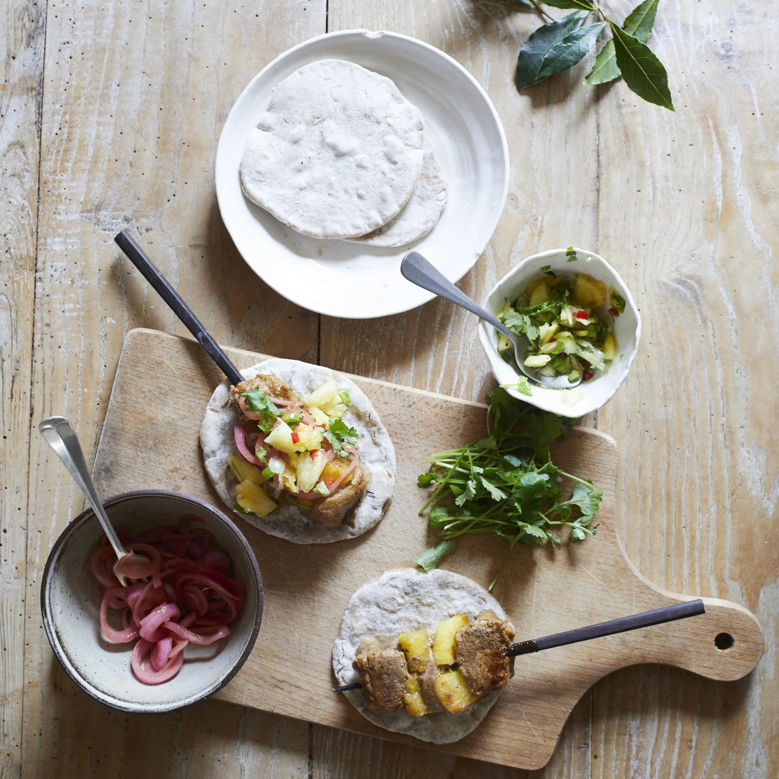 6 Warm the tortillas and place the skewers in the centre. Dust with a pinch of salt and top with pineapple salsa and the pink taco pickles.