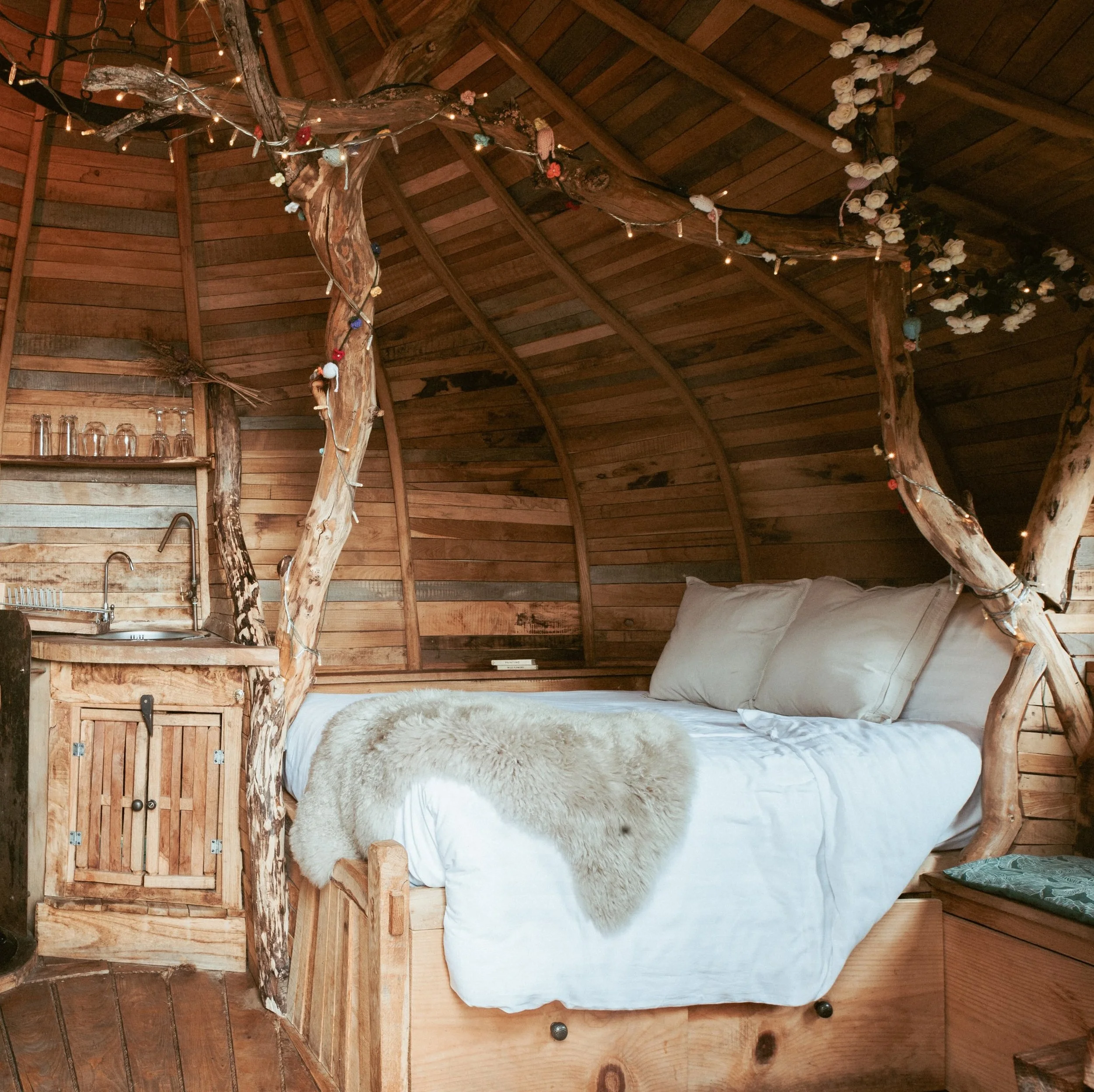 Step into your very own storybook stay at Elfie, an enchanting cabin for two. Small in size yet big in soul, you’ll feel wonderfully cocooned by the curved, wooden walls, branches wrapped in fairylights, and sweeping views across patchwork countryside. For magical extra touches, you can order organic breakfast hampers full of farm-fresh goods, and book visits to see the farm animals and beaver habitat.